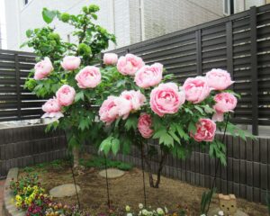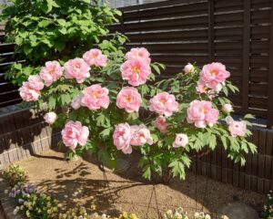 シャクヤクもいい感じに咲きましたね。花の重さで倒れないように、上手に支柱をされています。 淡いピンクの品の良い花、とても素敵です。おめでとうございます!