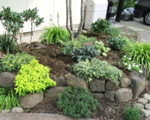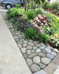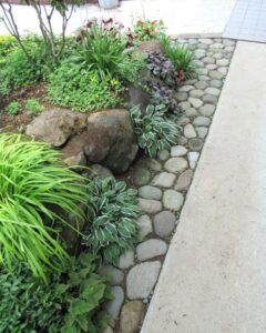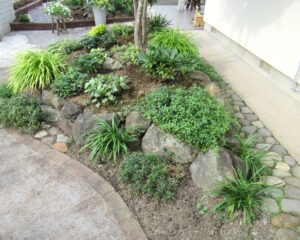 自然石の土留め石組と石畳、カラーリーフ多めの植栽で花がなくても華やかに見えるお庭です。