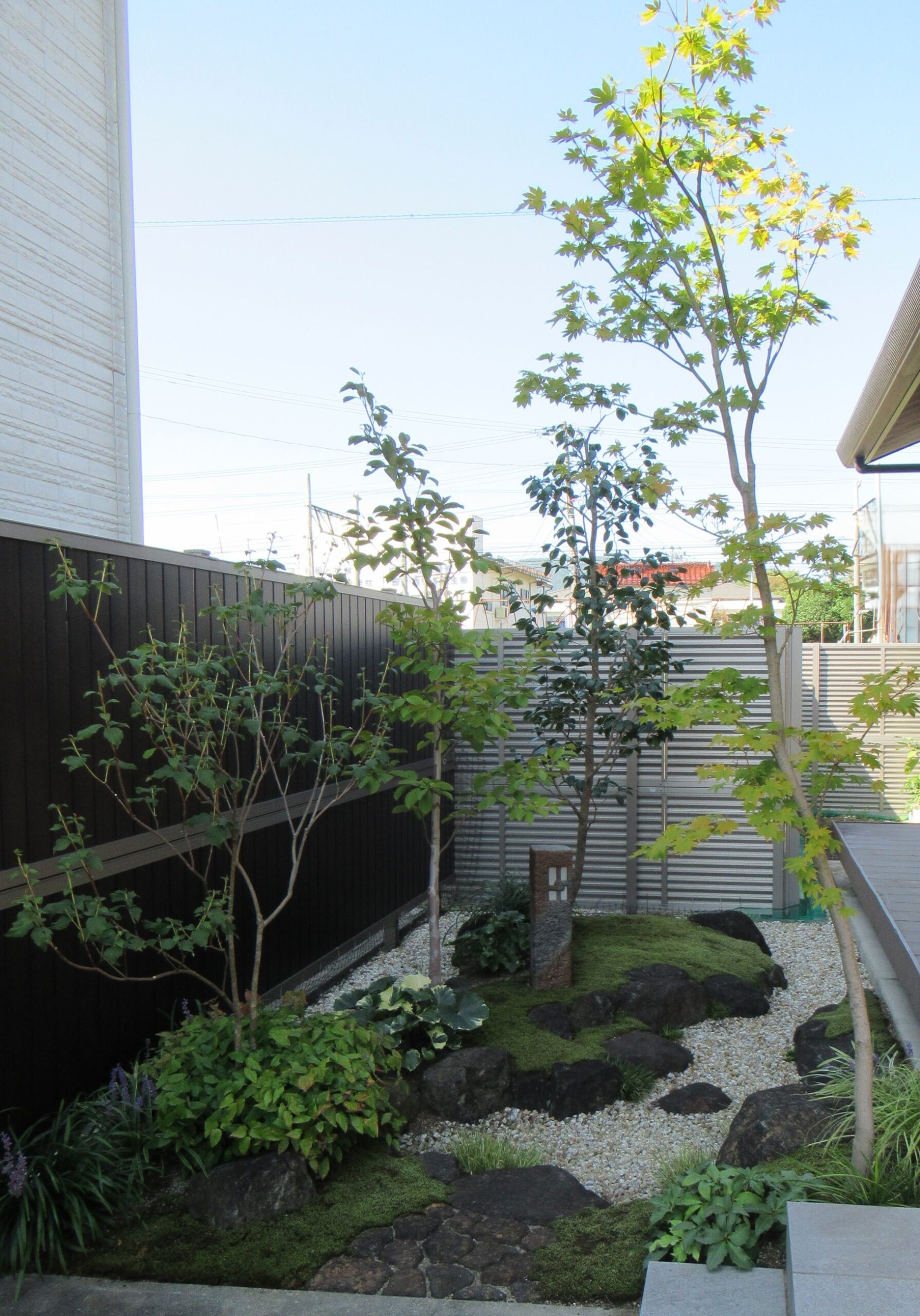 庭木はコハウチワカエデ、ヤブツバキ、ナツツバキ、ミツバツツジ