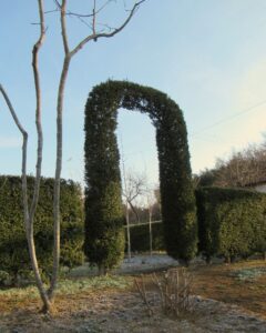 キンメツゲ生垣とアーチ「年2回、バリカンと鋏で刈り込む。」2025.3