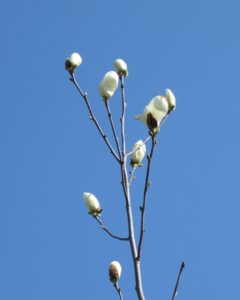ハクモクレン「白い綺麗な花。まだ若木で花が少ない。蕾のうちから鳥に食べられているようだ。春の寒風や霜でも花が痛む。豪華に咲くまで手入れを続けてみる。」2025.4