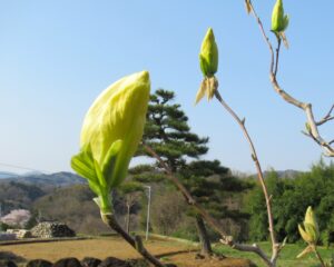キモクレン「ハクモクレンから少し遅れて咲く黄色いモクレン。蕾が綺麗。ハクモクレンと寄せて一本の木に見えるように植えてある。」2025.4