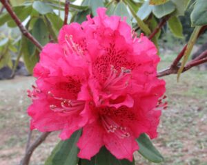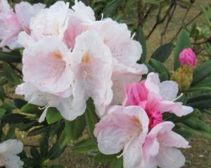 西洋シャクナゲ・品種不明「派手さは無い小振りな花だが、和洋問わず、程よく庭になじむ。これも良い。」2025.4