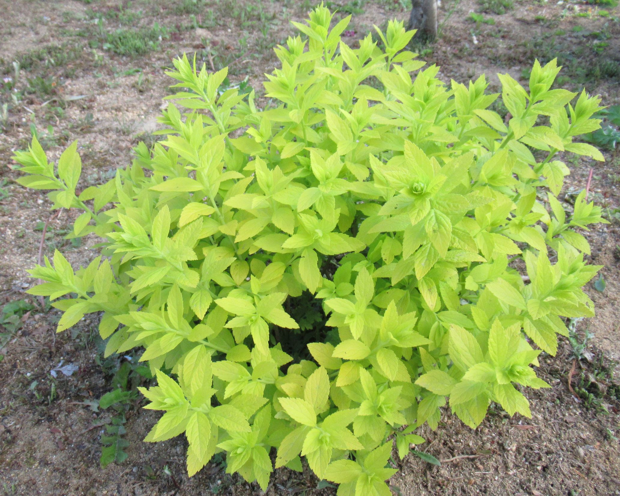 シモツケ・ホワイトゴールド「芽吹きは目を引くライム色の葉、育てやすいシモツケの園芸品種」2025.4