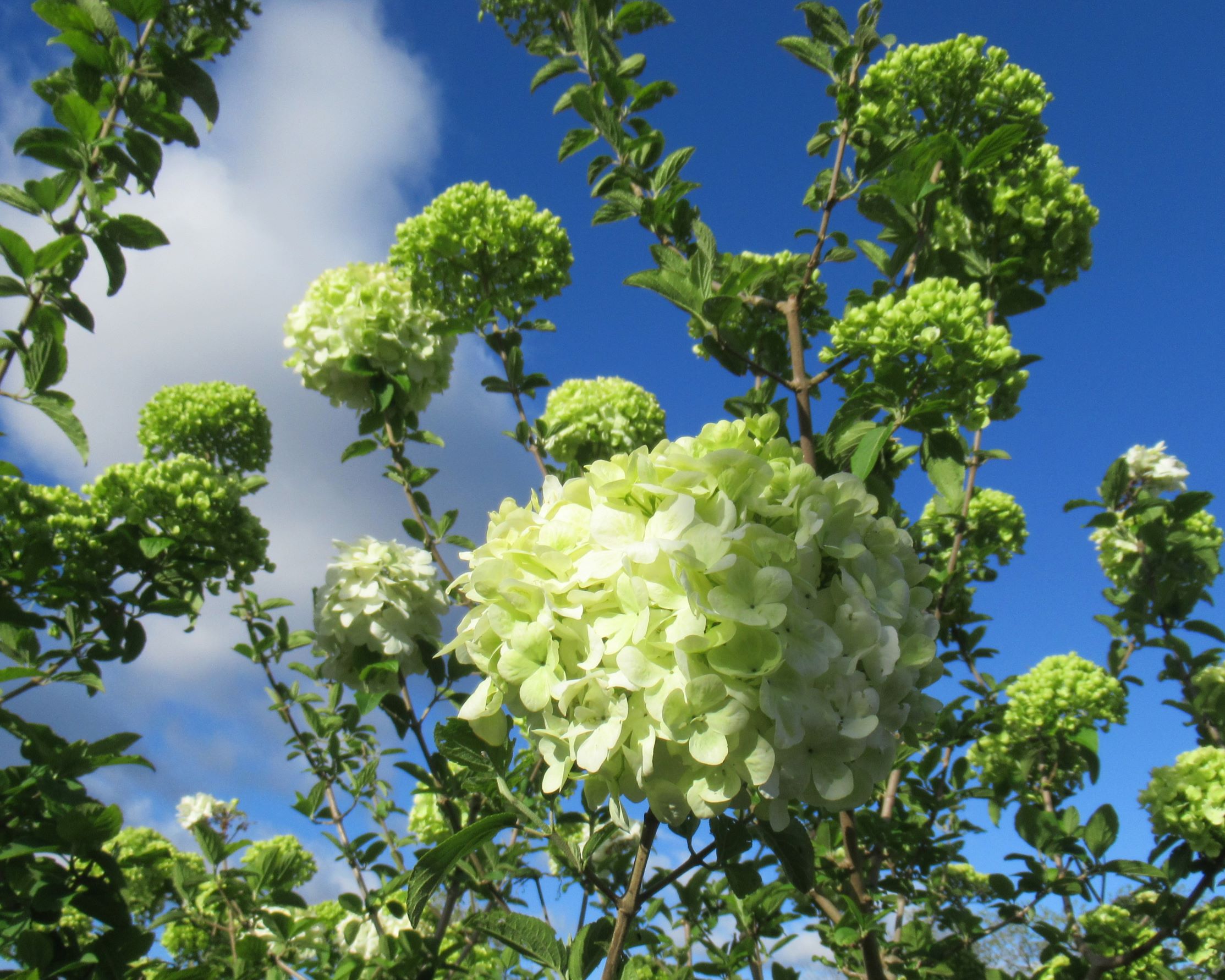 ビバーナム・ステリーレ「数日で、緑から白になってきた。 少し見上げるぐらいの高さで無造作に咲かせるのが良い木。らしさが大事!」2025.5