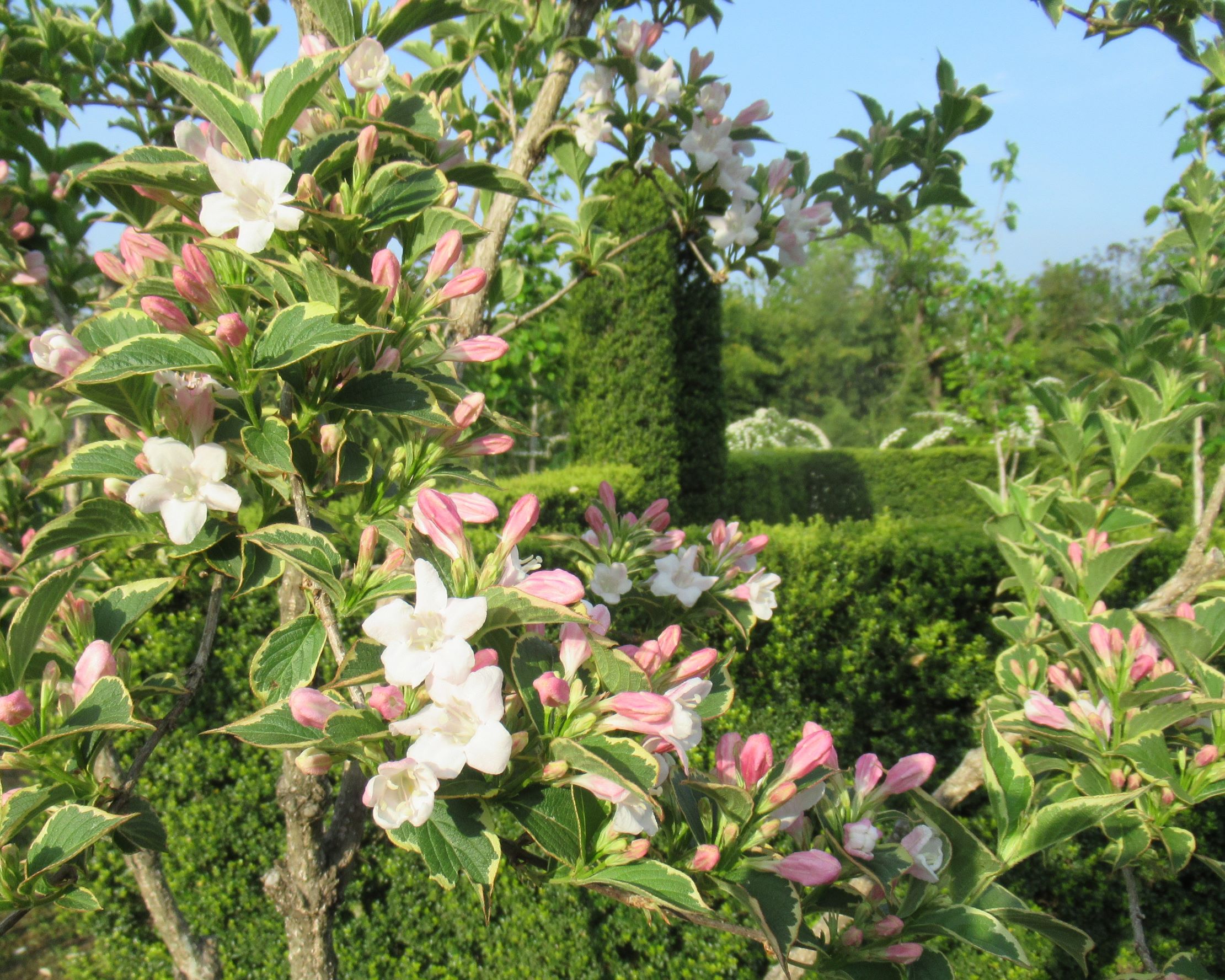 ワイゲラ・バリエガータ「斑入りの葉、2色咲き、始めは濃いピンクで徐々に白に。伸びやかな枝に咲く様が実に爽やか。」2025.5