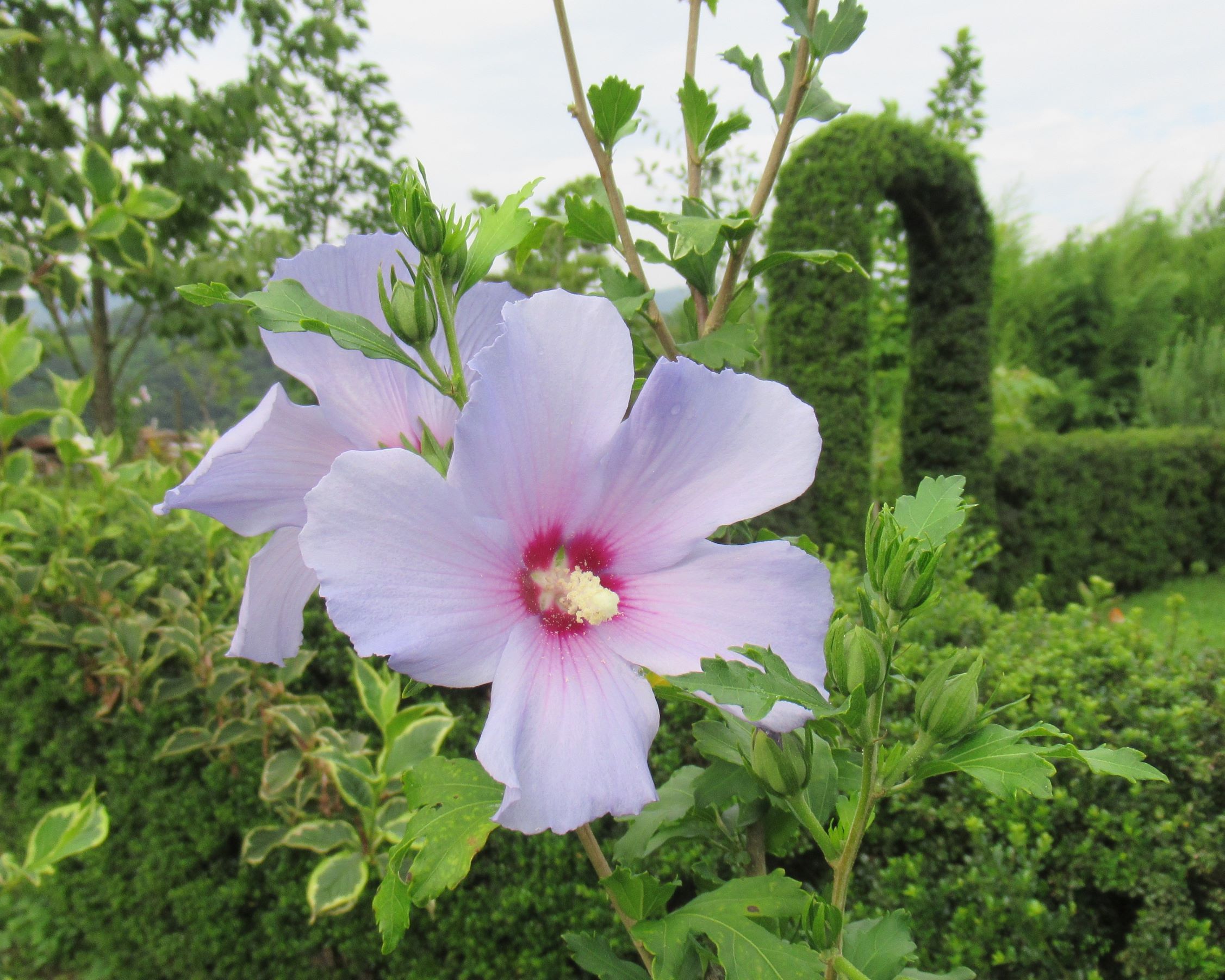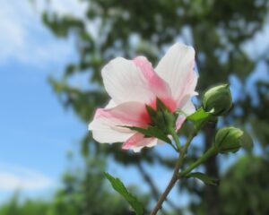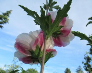 ムクゲ「花時期が長い夏の花。 目線の高さで咲かせるのがコツ。 今年は思ったように咲かなく物足りませんが、ご紹介します。」