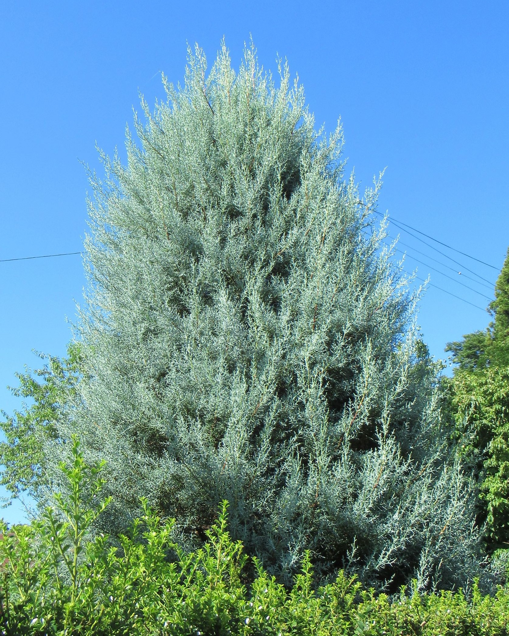 ブルーアイス「透きとおったシルバーブルーの夏の葉色が魅力。香りが好きな方もいらっしゃいますね。 刈り込まない剪定で、枝葉が綺麗に伸びていて、これも良い! ゴールドクレストのように大きくなる木ですので植える場所を選びましょう。広いお庭は別ですが、年1回の剪定は欠かさずに!」2025.8