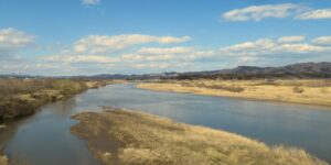 阿武隈川 角田橋「下流に向かって一枚。中州がある。この辺りに来ると福島市付近より川幅が広いな。流れの先にある海を思う。」