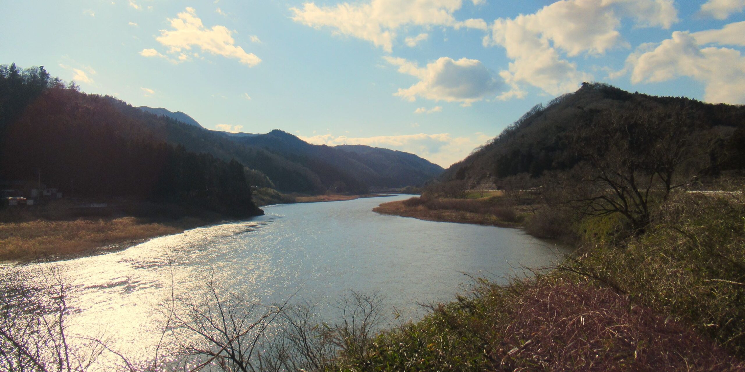 阿武隈川 丸森付近「上流に向かって一枚。山間に近づくにつれて右に左にくねってくる。上流の景色が気になる。」