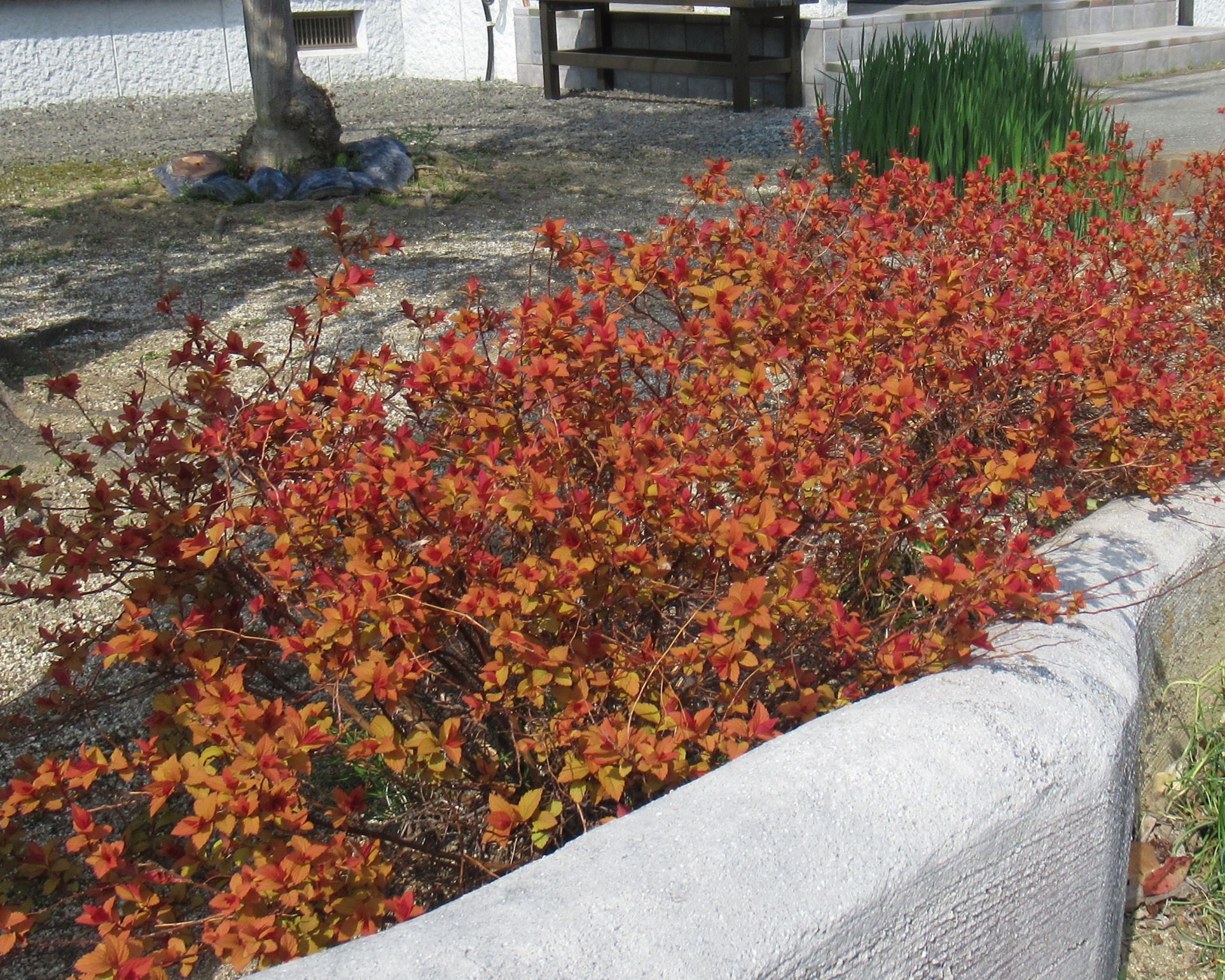 シモツケ・ゴールドフレーム「濃いオレンジ色の芽吹きが綺麗。冬は枝だけだが、春の芽吹きを待つのも良し。育てやすい木。」2025.4