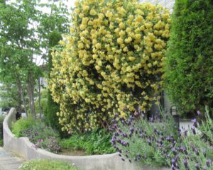 モッコウバラとストエカスラベンダー「ナイスセンス! こちらも素敵過ぎです。 カラーコーディネート成功。庭師ご満悦。」2025.5