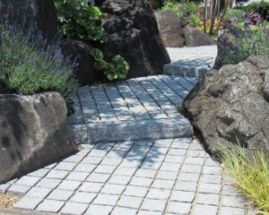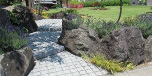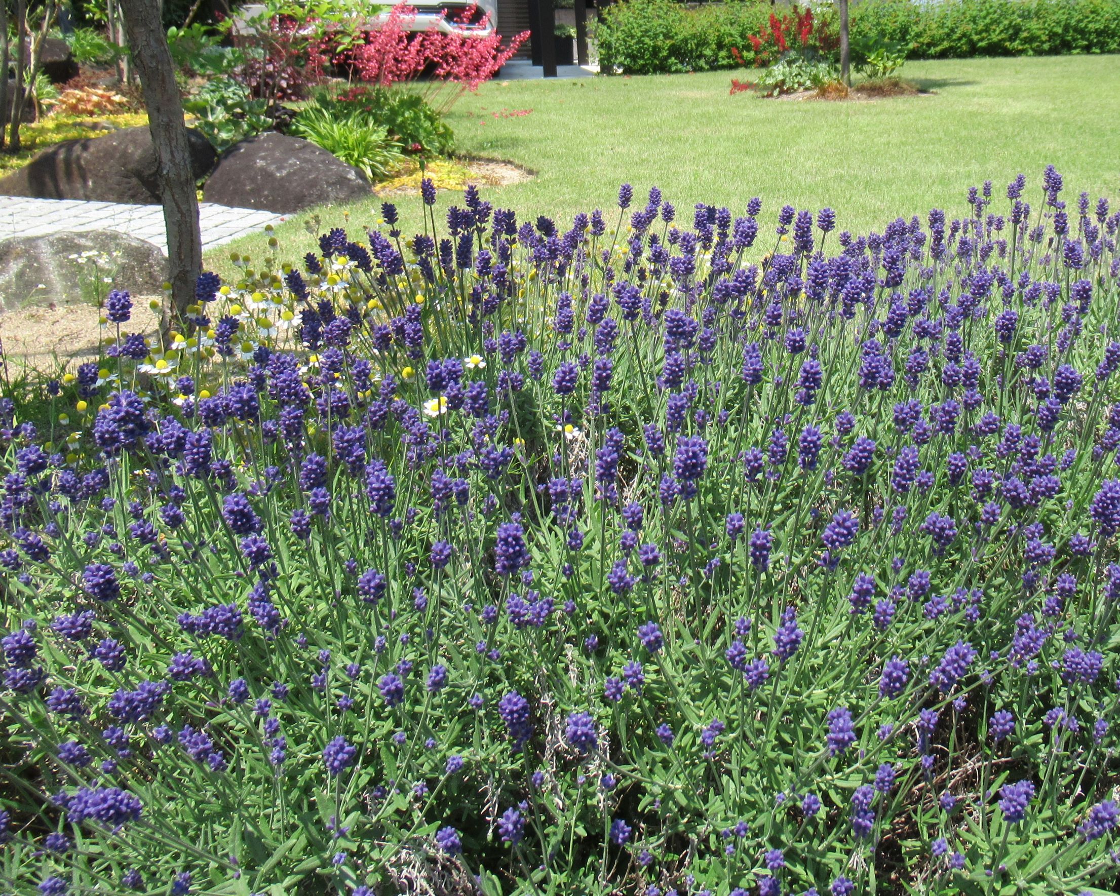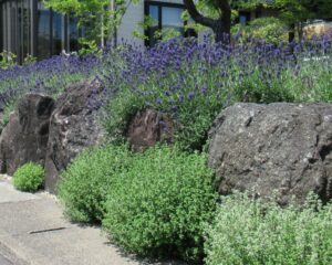 石組みとハーブ「自然石とハーブの組み合わせ。 イングリッシュラベンダーとタイム。 タイムは、シルバータイムとレモンタイムとゴールデンタイム。 タイムも剪定の結果が出ている。 同じものが一つも無い自然石の表情にも注目!」2025.5