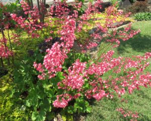 ヒューケラ「いろんな葉色がある人気の宿根草。この品種は花も綺麗ですね。 グリーン、ピンク、イエローと楽しい配色。黄色い葉はグラウンドカバーに植えたリシマキア・オーレア。」2025.5