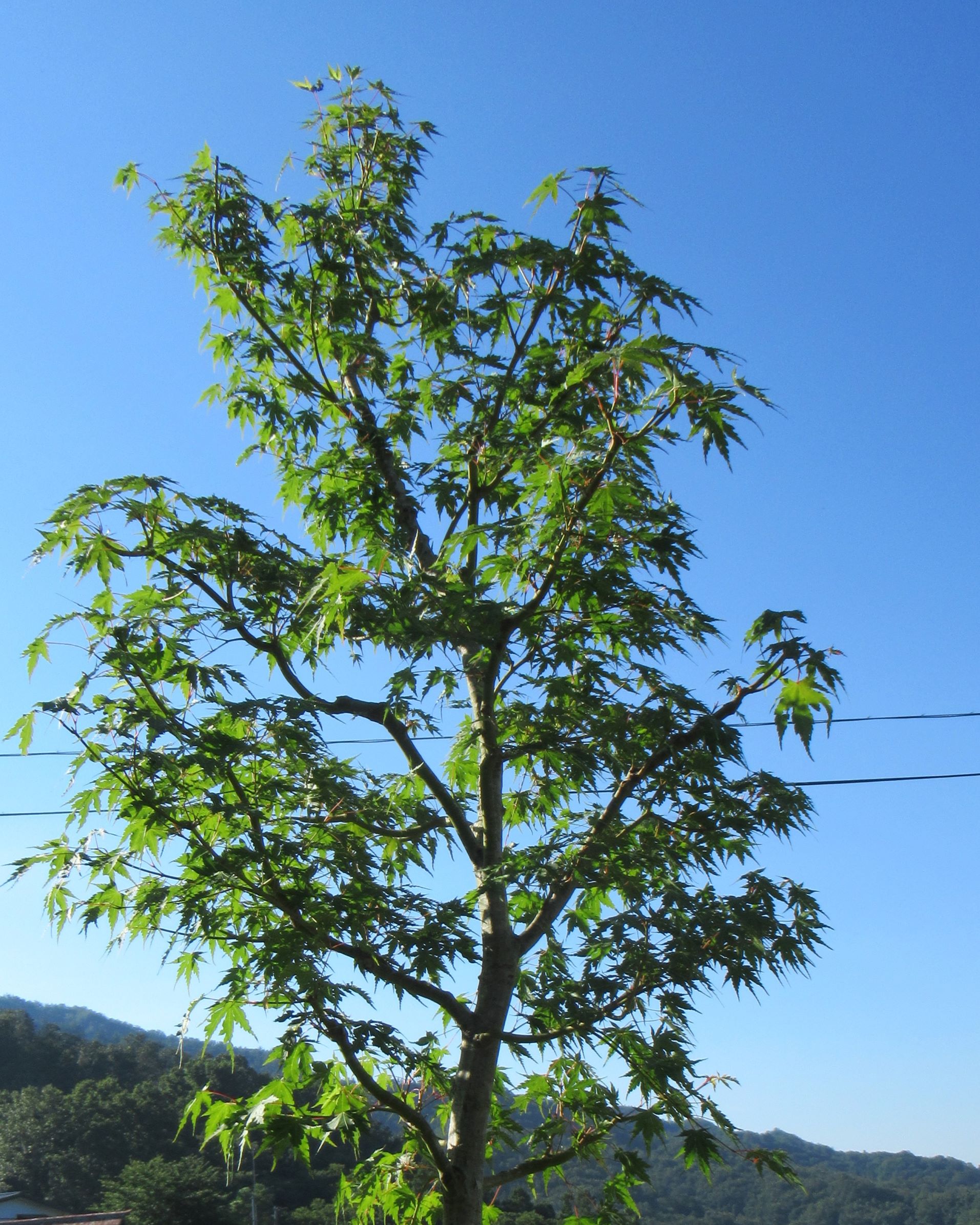 イロハモミジ剪定、同じ木2回目「年間の剪定回数は増えますが、サイズを維持し易く、何と言っても短時間で出来るのでコストを抑えられるのが良い。剪定くずも少ない。」2025.7