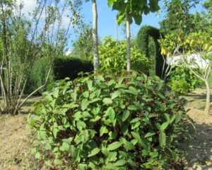 ヒペリカム・ヒデコート「葉焼けしないように、少し日差しが和らいだ8月に剪定。葉を切らずにざっくり切り揃える。この後に出揃う枝葉が綺麗。 庭によって剪定方法、時期、樹形を変えている。」2025.8
