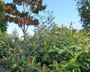 ヒペリカム・ヒデコート「剪定後、新芽が出揃う。 わずかに赤みを帯びた葉先が綺麗! 11月頃まで楽しめそう♪ ハナミズキ・ジュニアミスの紅葉、色付き始める」2025.9