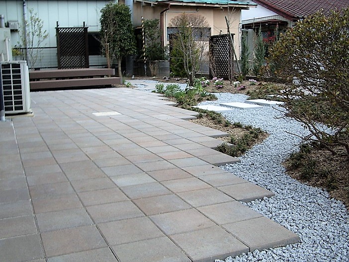 ガーデンテラス、通路、砂利を敷いているところは、除草の心配がなく、植栽スペースを狭くし、手入れしやすい工夫もしています。土の見えるところはグラウンドカバーの宿根草が成長し広がって行くのを期待しています。