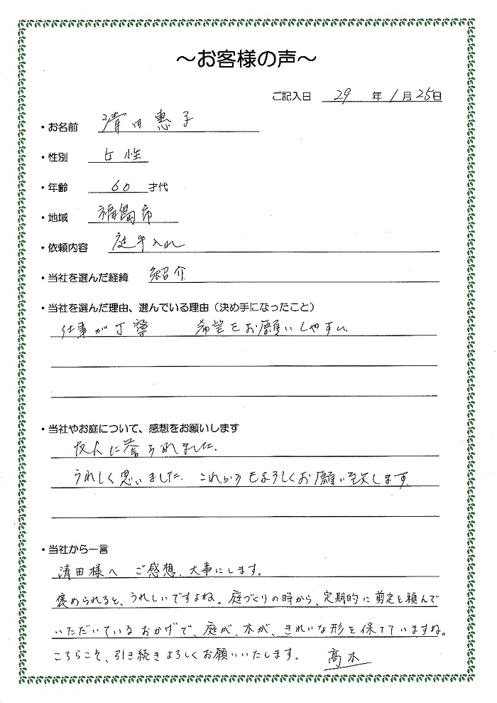 60代女性 清田様 庭手入れを依頼 「希望をお願いしやすい」 |