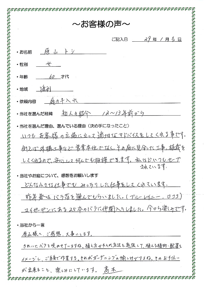 60代女性 原山様 庭手入れを依頼 「お客様の立場に立って」 |